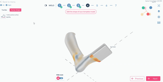 By clicking on 'plantar shape', we unveil our last feature of this step, which is our tool to flatten the plantar surface. Compared to the elevation of the toe-box, here we'll make the plantar surface more flat by adding material to the plantar part.