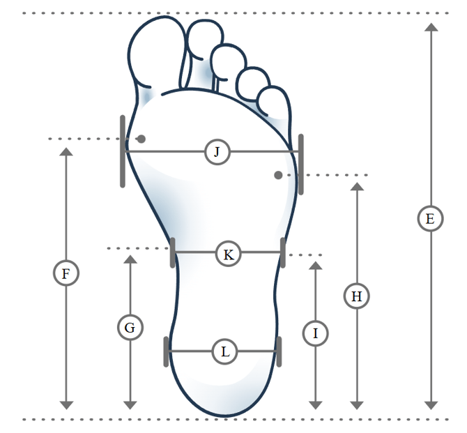 For metatarsal width measurement (J), apply pressure to splay the metatarsals, simulating full weight bearing