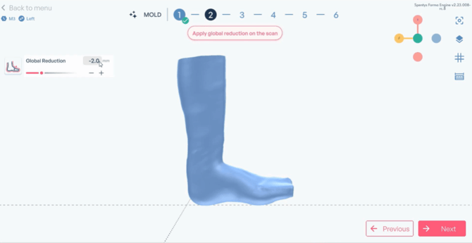 If you are working from a cast scan, you can reduce the thickness by a chosen number of millimeters to compensate for the material of the cast. For example, applying a reduction of 2 mm ensures that the mold reflects the actual limb dimensions rather than the outer surface of the cast.